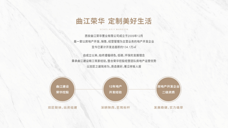 自成立以来,始终遵循绿色、低碳、环保的发展理念秉承曲江建设精工筑家经验,整合荣华控股经营团队房地产运营优势以双匠之建筑修为,质造美好,著立样板人居