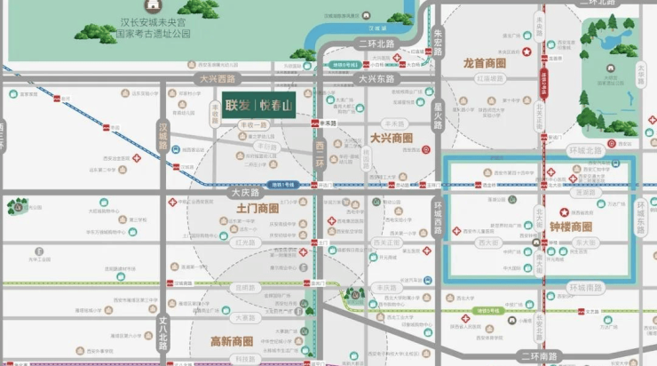 联发悦春山,项目位于莲湖区大兴快速路与丰收路交汇处。项目东临二环、北靠汉城湖遗址公园,主城核芯,处在二环金腰带上。