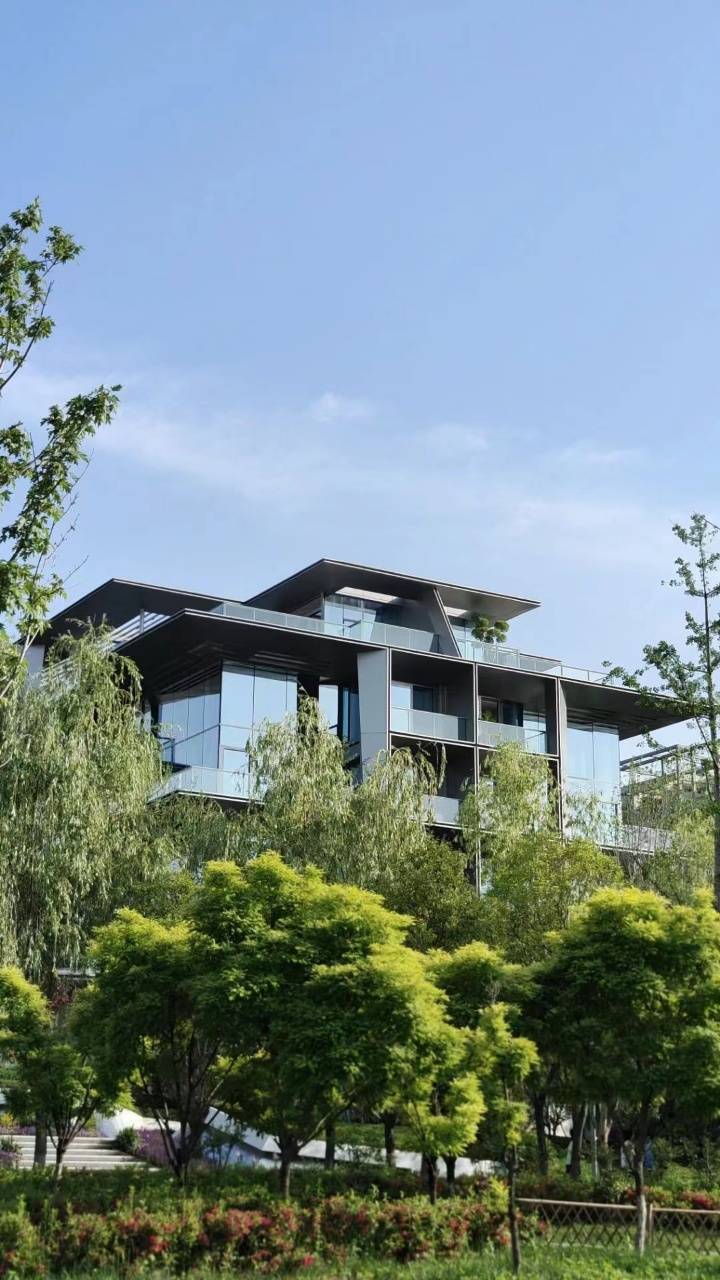 项目整体规划因地制宜,借助长安公园地块天然优势将建筑群落斜竖排布,依湖而建,营造四层低密大境
