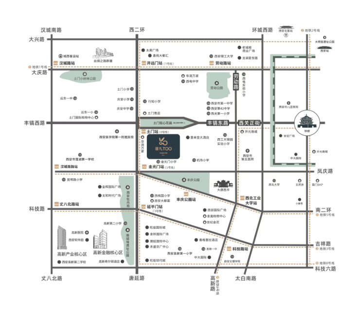 居礼TOO,位于城西核心区域——西二环十字东,地铁8号线(在建)土门站,45000㎡地标建筑,以磅礴姿态焕新城市封面。项目辐射高新、经开、西咸、莲湖四区,贯穿二环与地铁双线交通,汇聚一线产业资源,打造集酒店、商业、办公、生活等功能于一体的都会恒产。