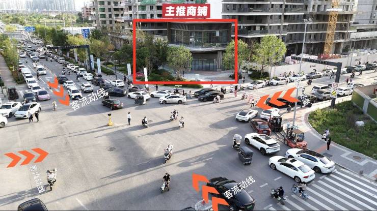 商铺自带6m高挑空,买一即得二,产证面积 196m²,实得面积196×2+30+30=452m², 是在售项目唯一纯一、纯二产品,位置正坐十字路口核芯之心,东南西北四路客流交汇,属于人流高密度聚集的中心位置。