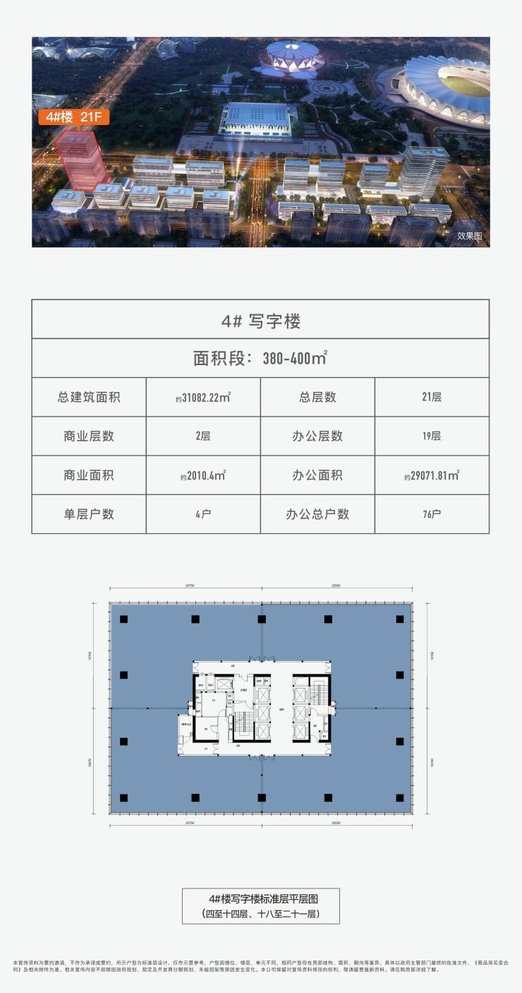 总建面约3.1万方,21F,主力户型建面约380-400㎡写字楼,⽆界式窗幕纵览奥体⽣态绿廊,俯瞰赛事/盛会中⼼,匹配企业的⾮凡⽓度。