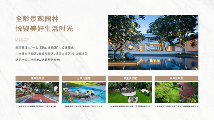全龄社区:汲泾阳八景之灵感,匠筑 “全龄情境互动式景观园林”,景观整体以“一心、两轴、多组团”为设计理念,内含健身活动区、分龄儿童区、邻里交流区、中央景观区 ,满足全龄生活需求,盛载舒居理想。