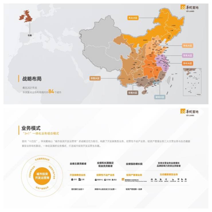 华润置地是华润集团旗下负责城市建设运营的业务单元综合实力榜TOP10商业地产TOP100榜单位列第1截至2021年底,业务布局境内外85个城市