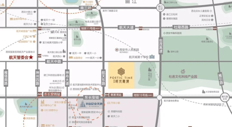 生态:项目东侧规划有市政公园,项目南侧的航腾公园占地8.8万㎡,除此之外周边还有明秦世子遗址公园、规划中的明秦宣王墓遗址公园、曲江文化运动公园、星河运动公园、中湖公园、揽月阁公园、西安航天城文化生态公园。