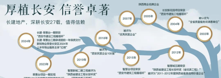 二十七载,用时间再鉴初心。长建地产,以“长久建筑,品质生活”的理念,27载匠诣积淀,深耕长安,与长安共生、与空间共鸣、与生活共美、与时间共鉴,敬献20余盘。数次荣膺陕西省建筑质量奖“长安杯”、西安市建设工程“雁塔杯”、“省级文明工地”、“国家优质工程奖”“西安市民营企业100强”等奖项。智慧城、智慧新城开创了“交房即领房产证”的 先例,成为西安“放心盘”、“保质盘”的代表,执楼市诚信之牛耳。翠景台一期在“提前100天交付”、“交房即领房产证”的同时,荣获2024年度西安市建设工程雁塔杯奖,再次为西安楼市树立榜样。