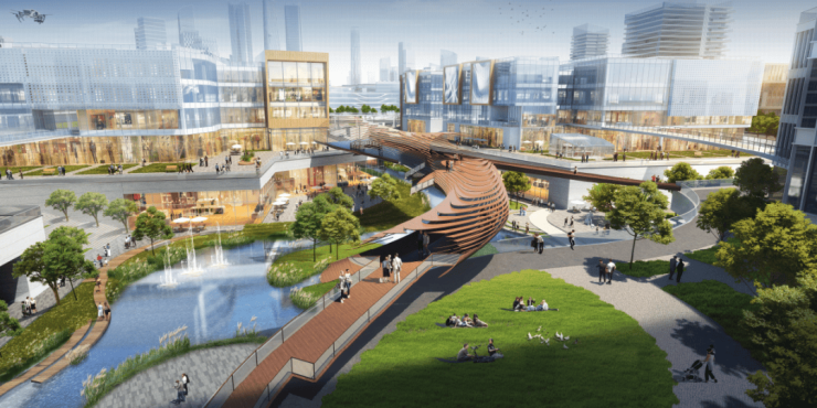 永安渠商业街占地约380.4亩,由12个商业设施地块组成,其中地上建筑面积约51万㎡,地下一层商业及配套建筑面积约20万平方米,全贯通的地下空间主要用于停车、配套及设备用房等,同时规划有多维地下环路,实现与周边商务等建筑的互联互通。永安渠创意水景贯穿中轴,构成独一无二的滨水商业街景。