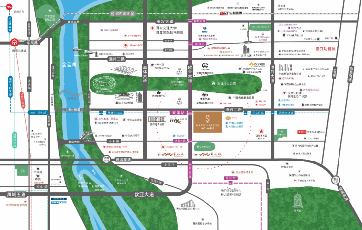 地铁3/14号线无缝对接、奥体大道、欧亚大道,串联大雁塔、曲江、高新、小寨,通达全城。