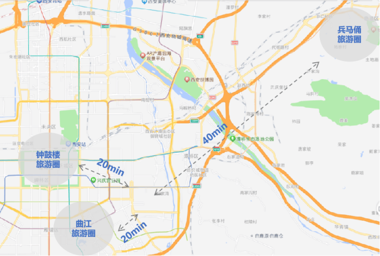 距曲江池、大唐芙蓉园、大唐不夜城等旅游圈直线距离约5km,车行时间约20min