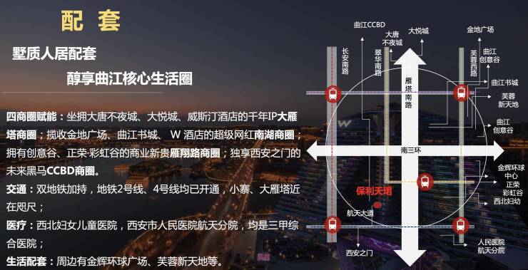 项目自带约5600方社区商业,地块内22万方商业综合体。东侧约1km可达西安环球金辉广场,约2km可达航天城星座广场,向西约3km可达南飞鸿商业街区,向北约3km可达曲江华润(电视塔)核心商务集群,距城南最高端万众商圈仅约4km,距离曲江CCBD南区商务核心区仅1km。