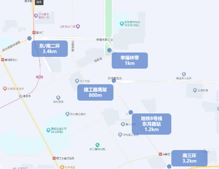 距曲江池、大唐芙蓉园、大唐不夜城等旅游圈直线距离约5km,车行时间约20min
