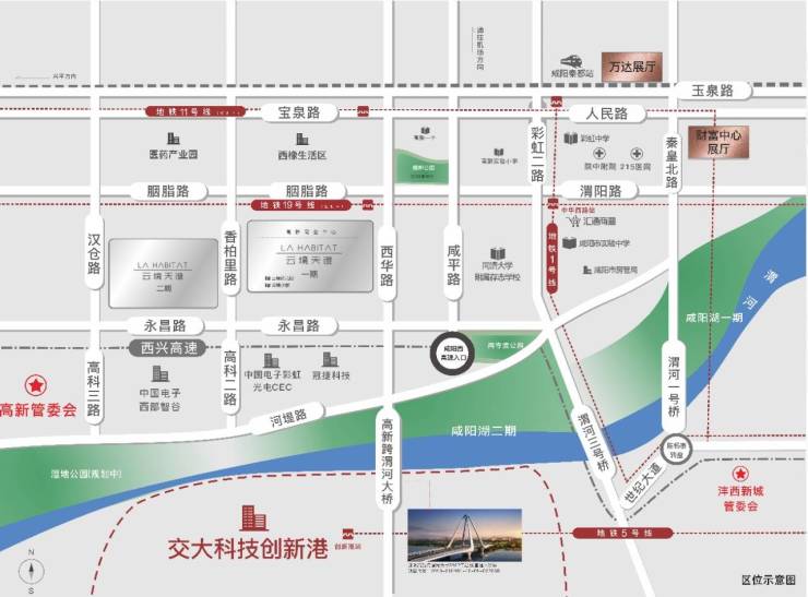 项目周边地铁一号线、五号线、十一号线(规划中)、十九号线(规划中)环绕,便捷的交通路网,无缝衔接西安-咸阳双城生活。