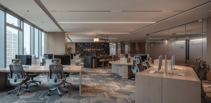 交付标准:穿孔铝板吊顶,有效吸音降噪;墙面乳胶漆;电动窗帘;地面架空地台130mm;(另可提供标准装修、定制装修);