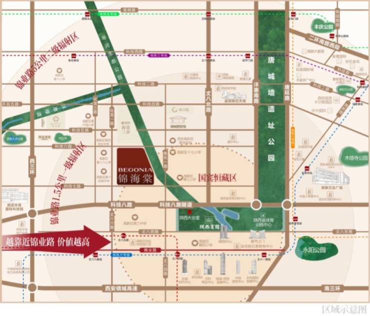 高端人居升级的“价值锚点”——这里占据高新一期核心、锦业路CBD、丝路软件城三大板块的黄金交汇,既是成熟生活区的封面,也是高端人群的聚居共识地。紧临皂河120m生态绿廊(高净值人群跑步道),1.5km直达锦业路,2km可上绕城。区域范围高端住宅社区密集,十万+消费群体给予商业发展巨大潜力。